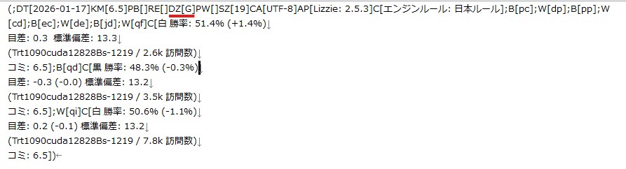 LizzieYzyで棋譜を保存すると、左図のように、SGFにDZというプロパティがあるのに気づきました。