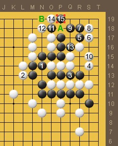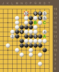 2021年に、桑本晋平七段が⿊9のとき⽩10と下がる変化を検討(3図のAからの変化)したところ、4図のように、これもコウになると結論づけている。
