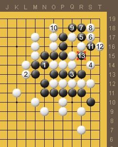 ⿊11に⽩12とこちらのアテは⿊13の妙手で⽩が落ちるので5図のようにコウにするしかない。