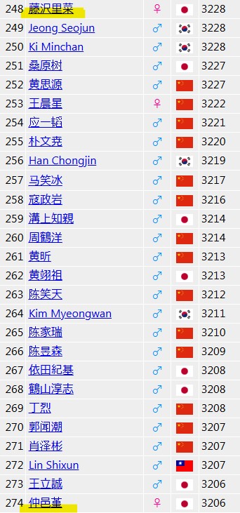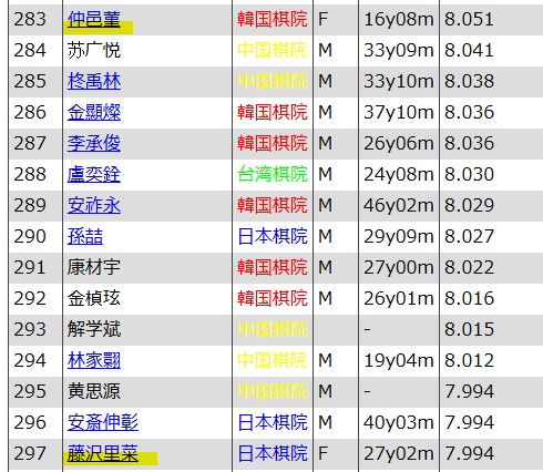 世界棋士ランキングで、仲邑菫が藤沢里奈を上回りました。